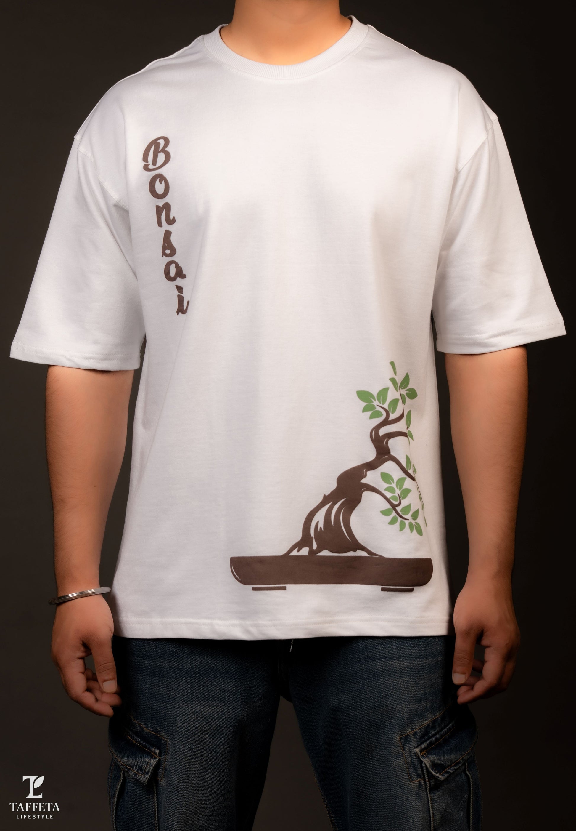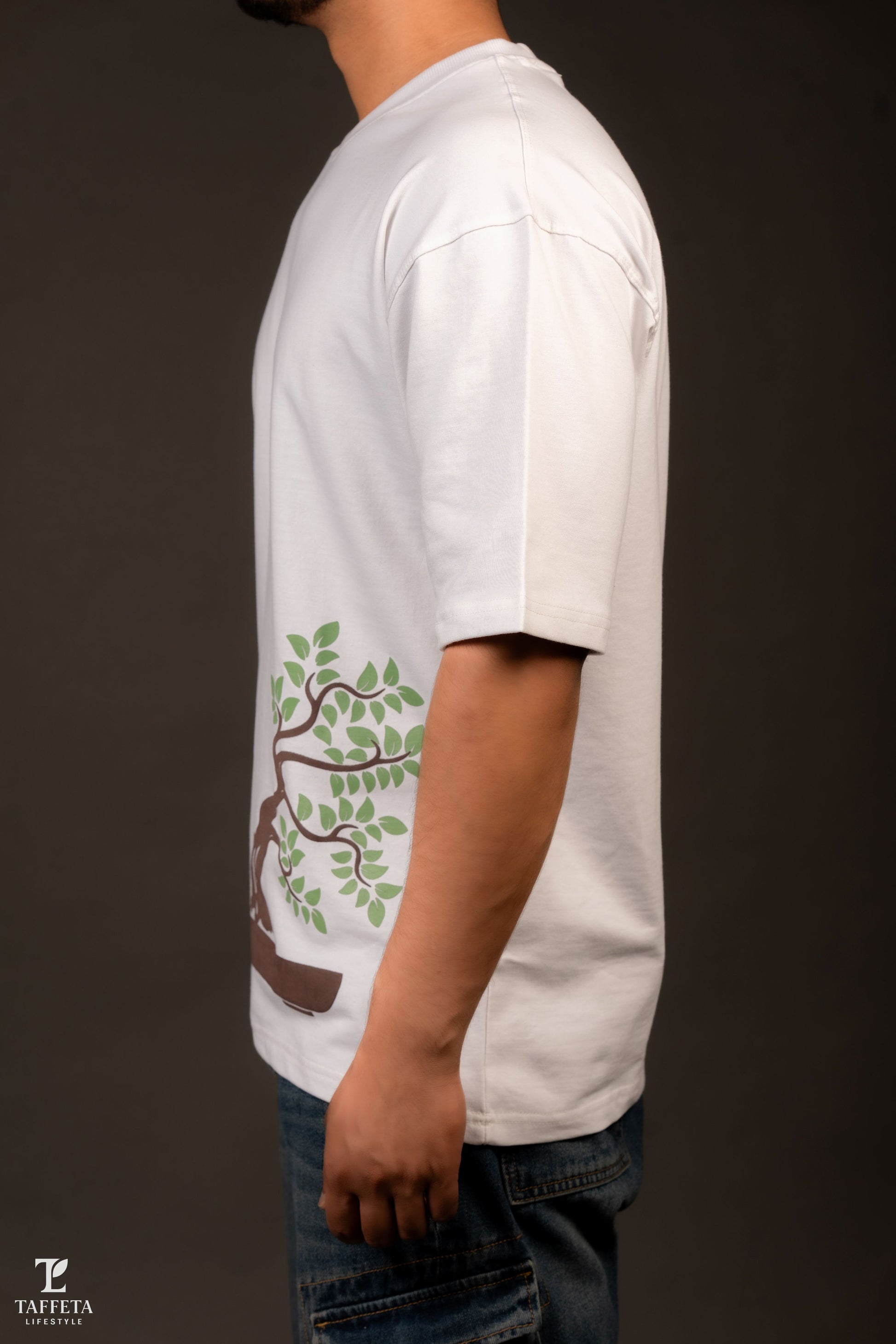Nature Inspired White T-Shirt With Bonsai Artwork